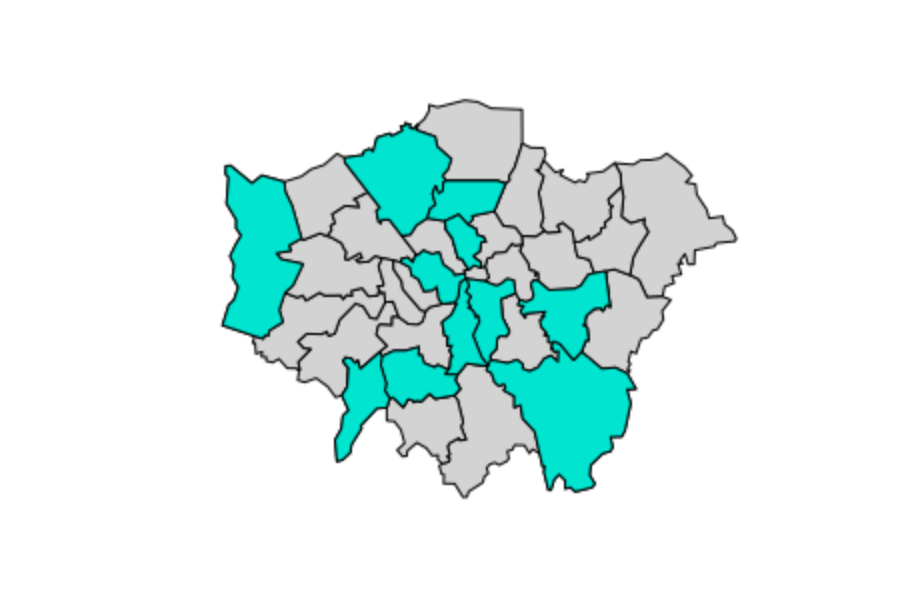 This produces a simple plot just outlining the shapes of the boroughs. What we would ideally want is to be able to get a sense of which areas hold various attributes, such as a high population or a high percentage that participates in sports just by looking at the map. Say, for example, we wanted to see with boroughs had levels of sports participation between 20 and 25%: