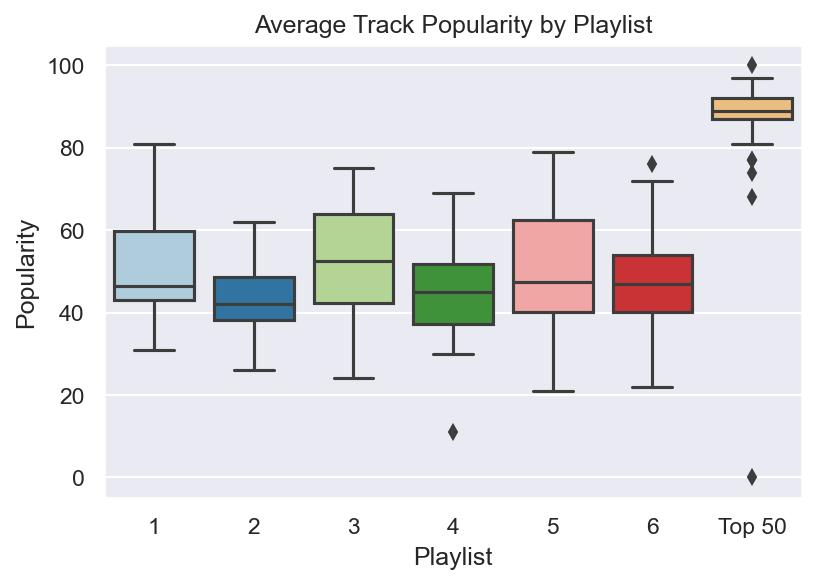 Popularity: I think 2 pictures are worth two thousand words here. The first image is a scatterplot showing the relationship between artist popularity and track popularity. It’s not a perfectly linear relationship, and there are a few outliers, but it’s close. Notice what playlist leads the pack.